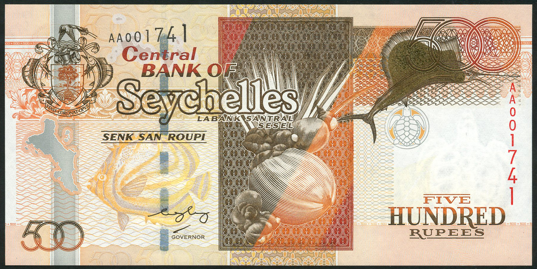 (x) Central Bank of the Seychelles, 50 rupees, ND (ca 2000), prefix AC, green and multicoloured, angel fish at centre, Laporte signature, also 100 rupees, ND (ca 2000), prefix AE, red and multicoloured, Vielle Babone Cecile fish at centre, Norman Weber signature, Chang Leng signatures, 100 rupees, prefix AK, red, Laporte signature, 500 rupees, ND (2005), serial number AA 011741, red and brown, gold foil sailfish, Coco de Mer palm, coat of arms and turtle, Chang Leng signature
