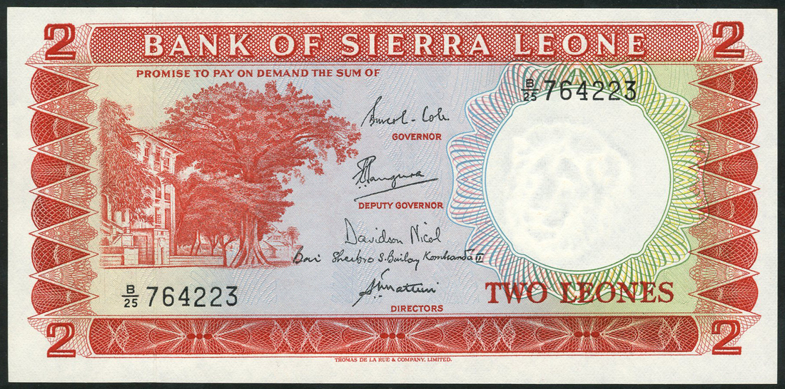 (x) Bank of Sierra Leone, 2 leones (4), ND (1964-1970), prefixes B/4,B/25,B/30,B/39, red and pale mauve and green, cotton tree and the Law Court Building in Freetown at left, signatures of Hall, Nicol-Cole, Easmon, Nicol and Williams//Nicol-Cole, Bangura, Komkanda II, Johnson, Broderick/Nicol-Cole, Bangura, Komkanda II, Johnson, Broderick/Bangura, Johnson, Fitzjohn, Johnson, Broderick respectively, reverse green, the diamond mine in Hangha