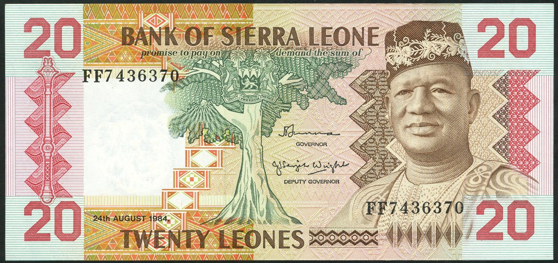 (x) Bank of Sierra Leone, 5 leones (6), 1975,1978,1980,1981,1984,1985, prefixes C/1,C/2,C/3,C/6,C/17,C/39, purple and multicoloured, also 10 leones (3), 1980,1984 (2), prefixes E/3,E/8,E/17 respectively, blue and multicoloured, all President Siaka P Stevens at left