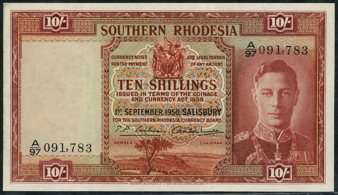 (x) Southern Rhodesia Currency Board, 10 shillings, 1 September 1950, serial number A/97 091783, red-brown and pale green and orange, a landscape in the Eastern Districts in background, George VI at right, value and arms at centre, signatures of Cochran and Gordon Monro low centre, value at centre and at top left and right, reverse red-brown, Victoria Falls and the Devil's cataract at centre, Sable antelope at left