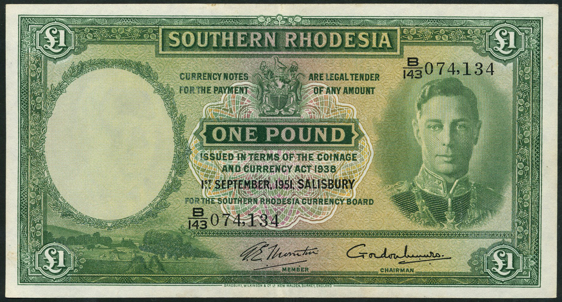 (x) Southern Rhodesia Currency Board, £1, 1 September 1951, serial number B/143 074134, green, orange and lilac, George VI at right, value and arms at centre, a pastoral scene in Melsetter at left, signatures of Thornton and Gordon Munro, value at centre and at top left and right, reverse green and pink, the Great Zimbabwe ruins at centre, Sable antelope at left
