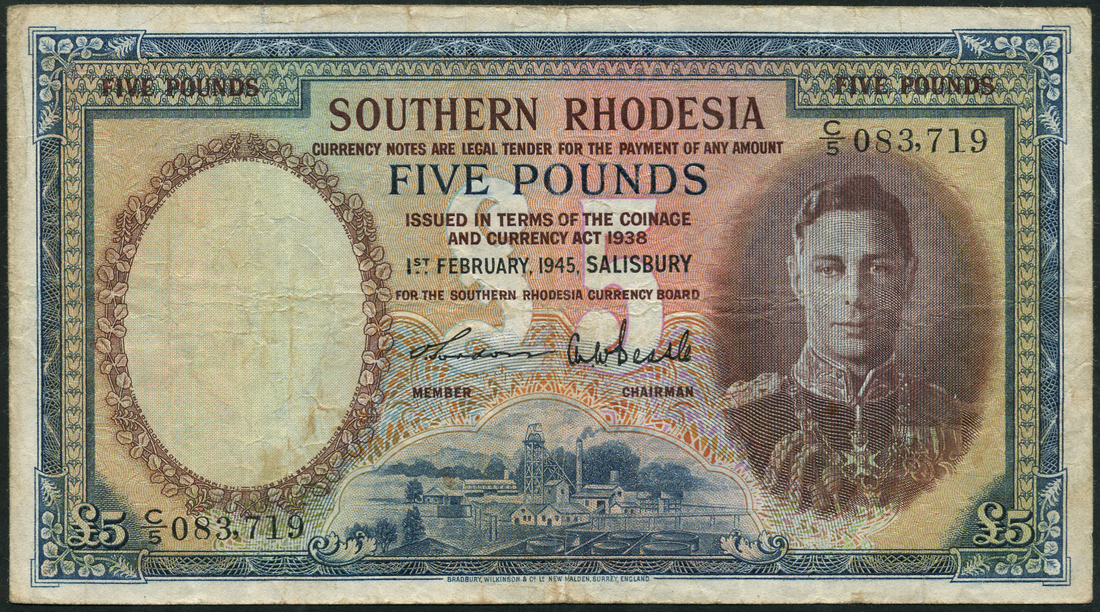 (x) Southern Rhodesia Currency Board, £5, 1 February 1945, serial number C/5 083719, blue and multicoloured, George VI at right, value and arms at centre, Wankie Colliery low centre, signatures of Gordon and Beadle low centre, value at centre and at top left and right, reverse blue/violet and pale orange, Victoria Falls and the Devil's cataract at centre, Sable Antelope at left, arms top centre