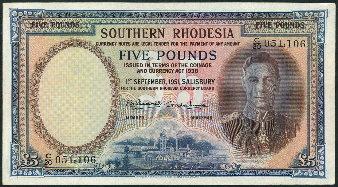 (x) Southern Rhodesia Currency Board, £5, 1 September 1951, serial number C/20 051106, blue and multicoloured, George VI at right, value and arms at centre, Wankie Colliery low centre, signatures of Simmonds and Gordon Munro low centre, value at centre and at top left and right, reverse blue/violet and pale orange, Victoria Falls and the Devil's cataract at centre, Sable Antelope at left, arms top centre