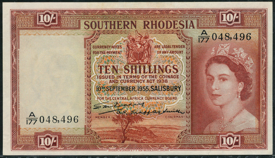 (x) Southern Rhodesia, Central African Currency Board, 10 shillings, 10 September 1955, serial number A/177 048496, red-brown and pale green and orange, a landscape in the Eastern Districts in background, Elizabeth II at right, value and arms at centre, signatures of Pechey and Grafftey-Smith low centre, value at centre and at top left and right, reverse red-brown, Victoria Falls and the Devil's cataract at centre, Sable antelope at left