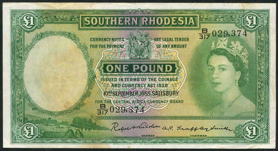 (x) Southern Rhodesia, Central African Currency Board, £1, 10 September 1955, serial number B/317 029374, green, orange and lilac, Elizabeth II at right, value and arms at centre, a pastoral scene in Melsetter at left, signatures of Nicholson and Grafftey-Smith low centre, value at centre and at top left and right, reverse green and pink, the Great Zimbabwe ruins at centre, Sable antelope at left