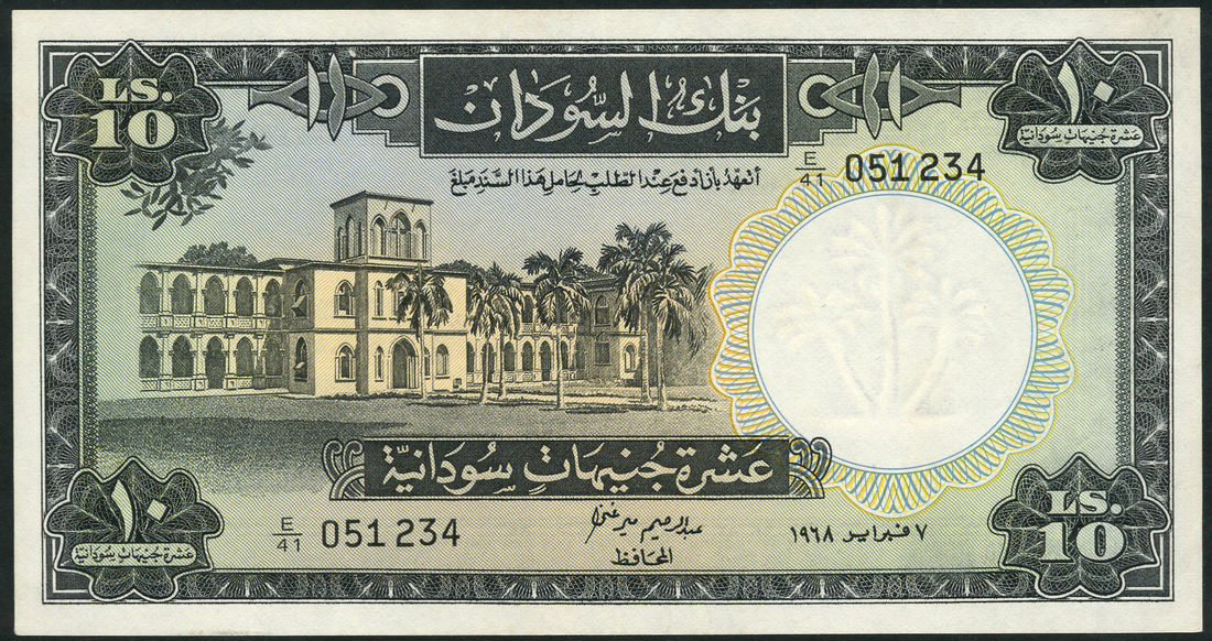 (x) Bank of Sudan, 10 pounds (2), 1966,1968, prefixes E/31 and E/41, grey-black and pale green, University of Khartoum at left, signatures of Elfeel and Mayrgani respectively, reverse grey-black and pale green, camel postman