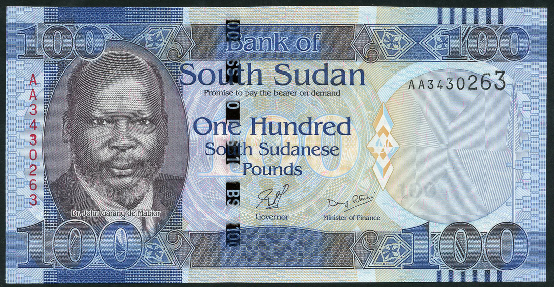 (x) Bank of South Sudan, a set of the ND (2011) Issue, all John de Mabior at right or left, comprising 5 Piasters, grey; 10 Piasters, green; 25 Piasters, lilac; 1 Pound, green; 5 Pounds, carmine; 10 Pounds, blue-green; 25 Pounds, brown; 50 Pounds, purple; 100 Pounds, blue