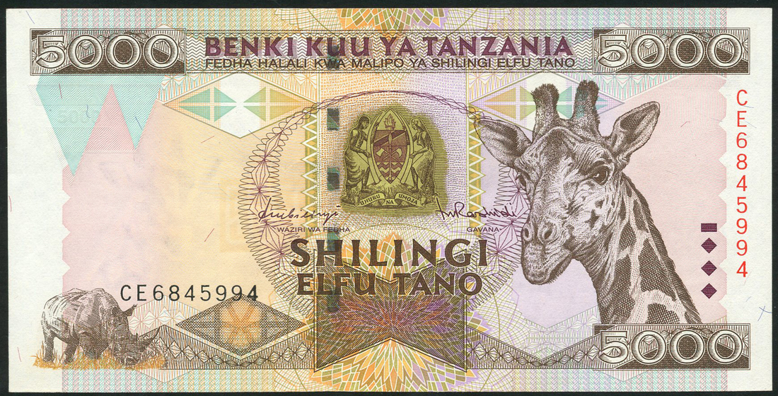(x) Bank of Tanzania, a set of the ND (1997) Issue, all giraffe's head at right, comprising 500 Shilingi, blue-black and green; 1000 Shilingi, olive-green; 5000 Shilingi, brown and 10,000 Shilingi, blue-black and grey; also a group of the 2003 ND Issue comprising 500 Shilingi, green, buffalo at right; 2000 Shilingi, signature 14, brown, lion at right; 5000 Shilingi, purple, rhinoceros at right and 10,000 Shilingi, rose, elephant at right