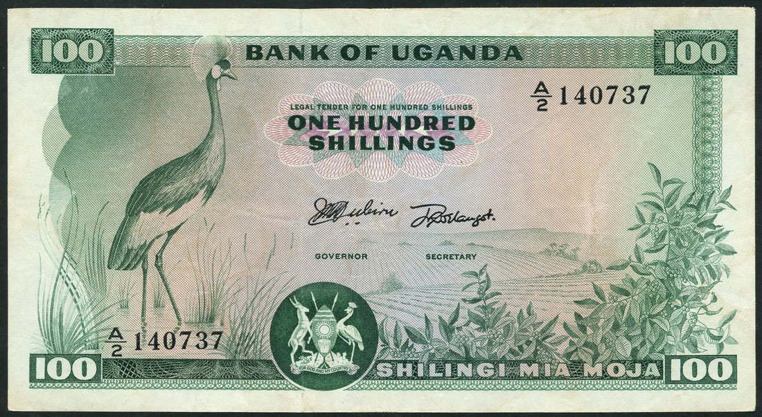 (x) Bank of Uganda, 100 Shillings ND (1966),serial number A/2 140737, green, crowned crane at left, without FOR BANK OF UGANDA below value at upper centre, reverse parliament building in Kampala