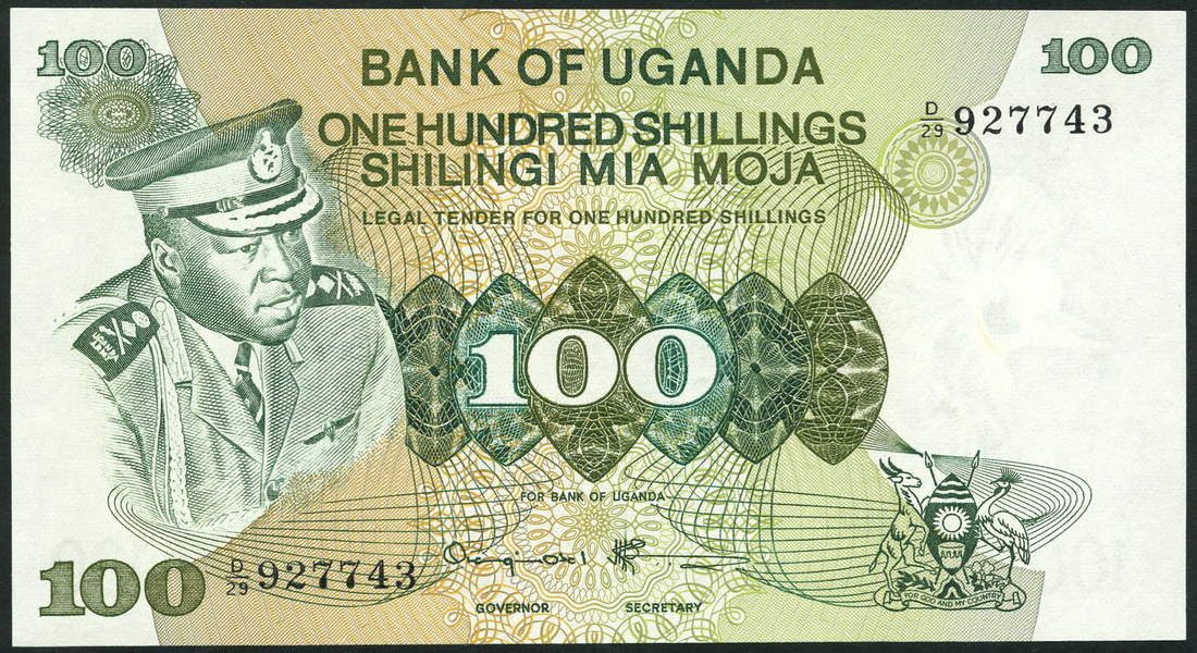 (x) Bank of Uganda, a group of the ND (1973-77) Issue, all President Idi Amin at left, comprising 5 Shillings, blue; 10 Shillings (3), signatures Governor and Director, Governor and Secretary 1 and 2, brown; 20 Shillings (3), signatures Governor and Director, Governor and Secretary 1 and 2, purple; 50 Shillings (3), signatures Governor and Director, Governor and Secretary 1 and 2, blue; 100 Shillings (3), signatures Governor and Director, Governor and Secretary 1 and 2, green