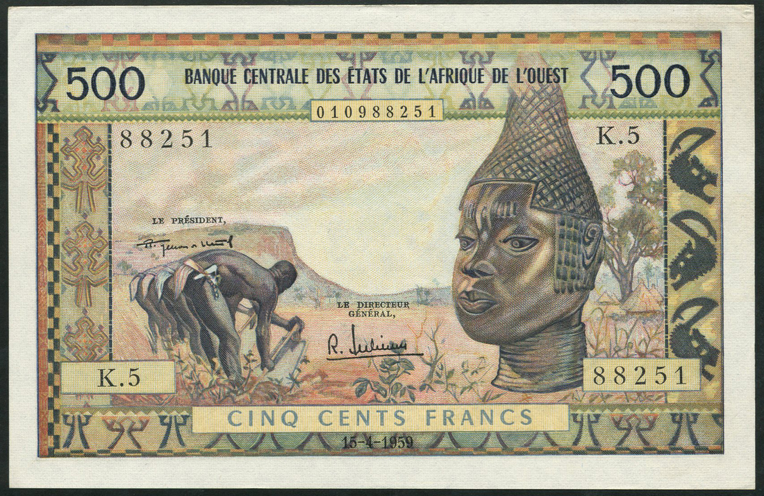 (x) Banque Centrale des Etats de l'Afrique de l'Ouest, French West Africa, 50 francs, ND (1958), prefix J67, green, three women at centre, 100 francs (2), 1959, prefix F77, multicoloured, girl and mask, 500 francs, 1959, ND, prefix K5, green, carving at right, field workers at left, 1000 francs, 1959, prefix F2, multicoloured, man and woman at right, all signatures of Tezenas du Montcel and Julienne except the second 100 francs (signature 5), no code letter for country