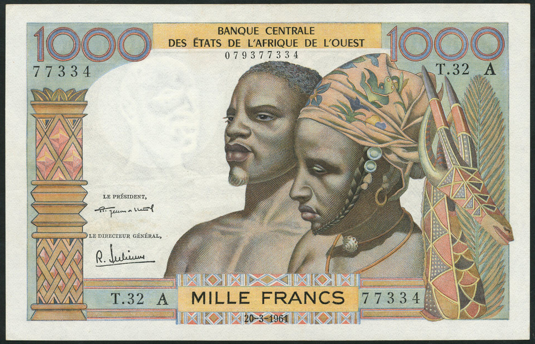 (x) Banque Centrale des Etats de l'Afrique de l'Ouest, West African States, 100 francs (2), 1961,1964, prefixes S90A,Y206A, Ivory Coast, brown and red, girl at right, mask at left, signatures 1 and 3, 500 francs (2), ND (1977), prefix X29, green and multicoloured, mask at right, field workers at left, signature 11, 1000 francs (2), 1961, ND (1977), prefixes T32A,G157A, multicoloured, man and woman at right, signatures 1 and 11
