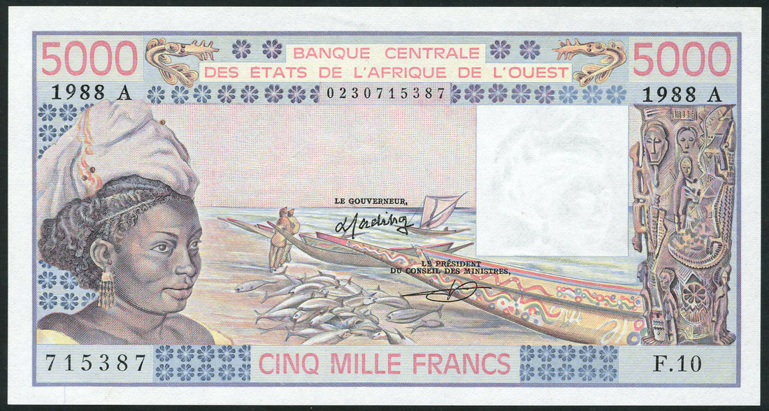 (x) Banque Centrale des Etats de l'Afrique de l'Ouest, West African States, 5000 francs (4), 1988A,1989A,1990A,1991A, Ivory Coast, prefixes F10,A011,M011,L012 respectively, blue and multicoloured, woman at left, fishermen at centre, signatures 14,21,22, also 10000 francs, ND (1977-), prefix W, red-brown and multicoloured, men spinning, signature 13