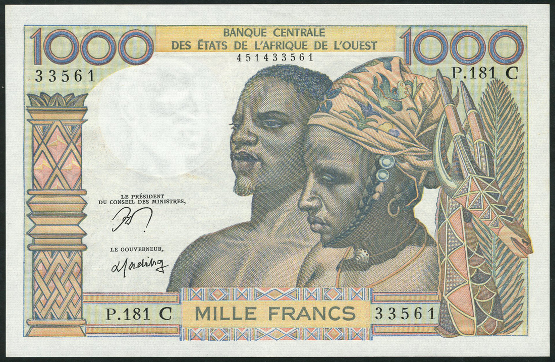 (x) Banque Centrale des Etats de l'Afrique de l'Ouest, West African States, 100 francs, ND (1965), prefix V245C, Burkina Faso, brown and red, girl at right, mask at left, signatures 4, 1000 francs ND (1978), prefix P181C, multicoloured, man and woman at right, signature 12