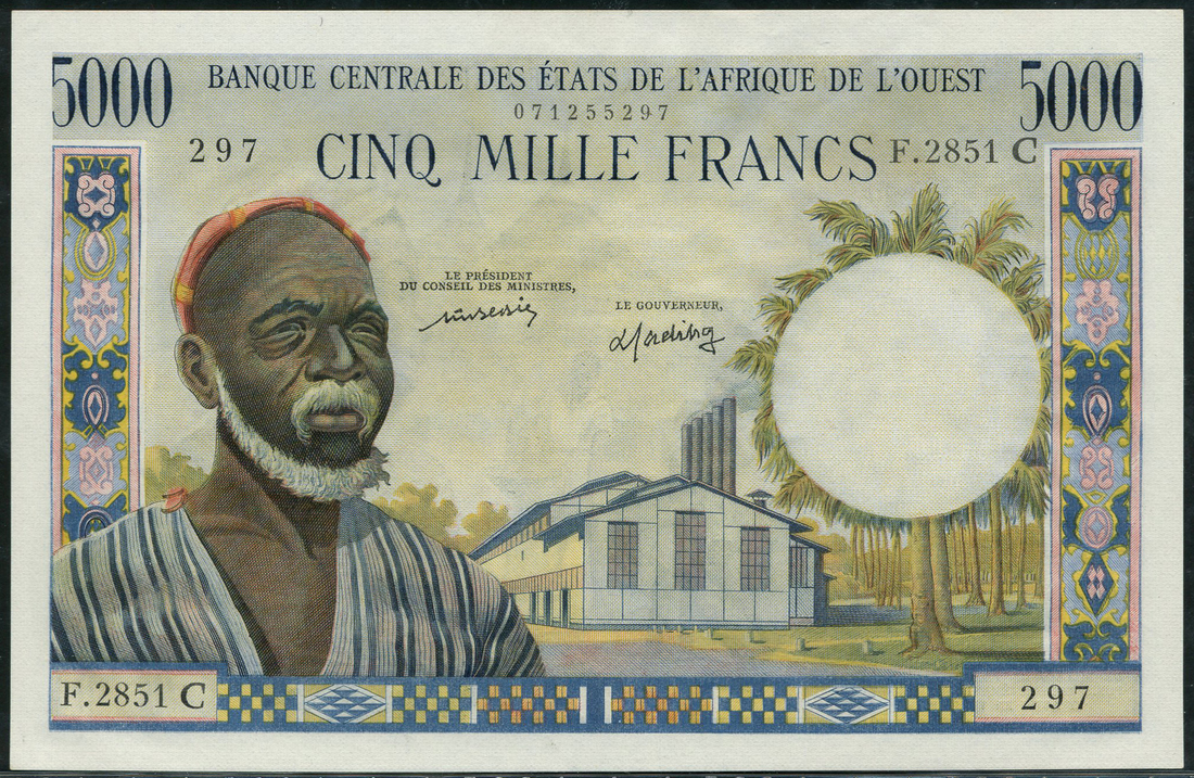 (x) Banque Centrale des Etats de l'Afrique de l'Ouest, West African States, 5000 francs, ND (ca 1977), prefix F2581C, Burkina Faso, blue and multicoloured, man at left, factory building in right field, palm trees at right, ornate border at left and right, value in blue top left and right, signatures 11, Bedie and Fadiga, reverse multicoloured, woman at right, villages and huts at centre