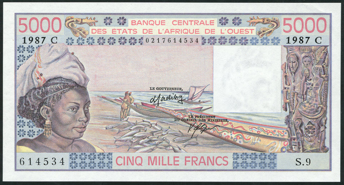 (x) Banque Centrale des Etats de l'Afrique de l'Ouest, West African States, 5000 francs (4), 1987C,1988C,1990C,1992C, Mauritania, blue and multicoloured, woman at left, fishermen at centre, signatures 20,14,21,23
