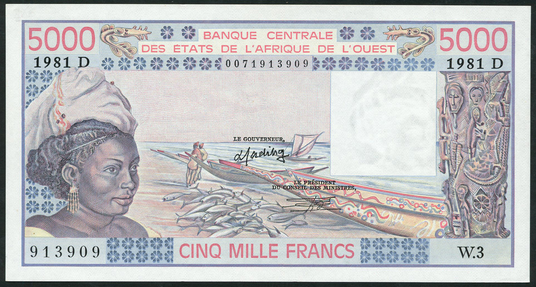 (x) Banque Centrale des Etats de l'Afrique de l'Ouest, West African States, 5000 francs (3) 1981D (2),1984D, Mali, prefixes X3,W3 and B6 respectively, blue and multicoloured, woman at left, fishermen at centre, signatures 15 and 17
