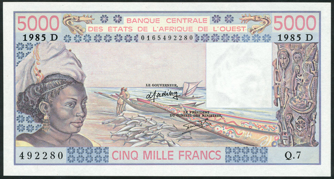 (x) Banque Centrale des Etats de l'Afrique de l'Ouest, West African States, 5000 francs (4) 1985D,1986D,1988D Mali, prefixes A10,Q7,W7 and M9 respectively, blue and multicoloured, woman at left, fishermen at centre, signatures 19, 20 and 14