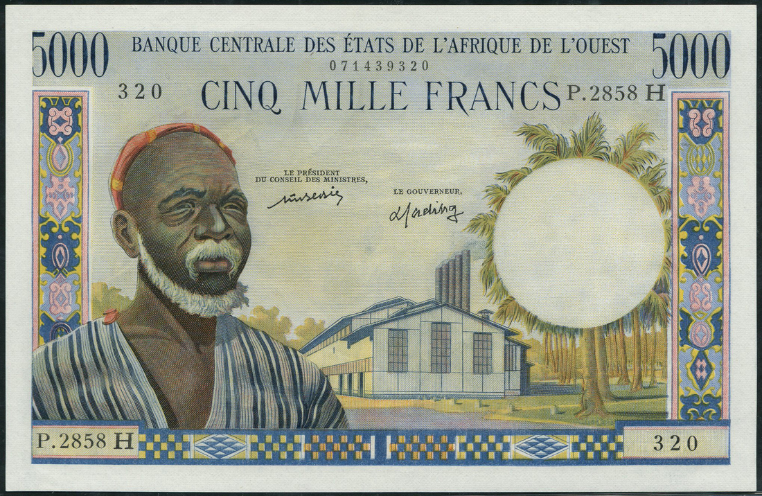 (x) Banque Centrale des Etats de l'Afrique de l'Ouest, West African States, 5000 francs, ND (1977), serial number P2858H-320, Niger, blue and multicoloured, man at left, factory building in right field, palm trees at right, ornate border at left and right, value in blue top left and right, signature 11, Bedie and Fadiga, reverse multicoloured, woman at right, villages and huts at centre