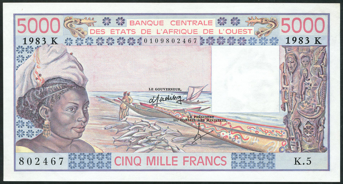 (x) Banque Centrale des Etats de l'Afrique de l'Ouest, West African States, 5000 francs (4), 1983K (2),1984K,1987K, Senegal, prefixes K5,W5,F6 and M1 respectively, blue and multicoloured, woman at left, fishermen at centre, signatures 16,17,18,20