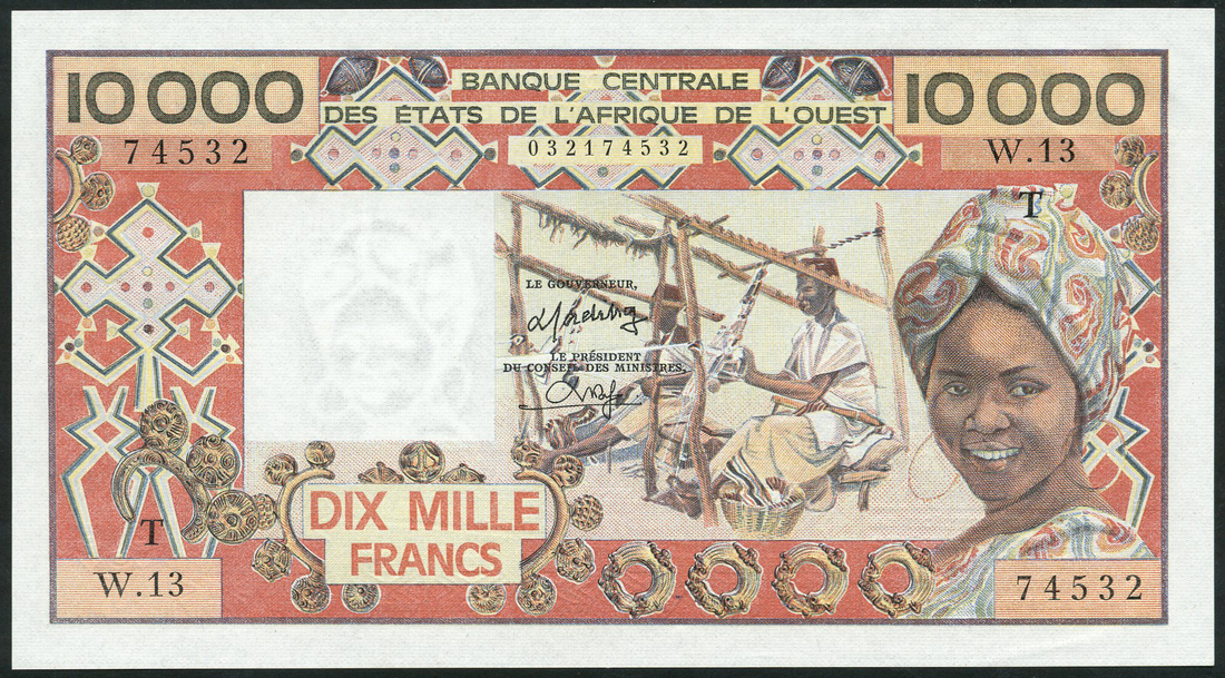 (x) Banque Centrale des Etats de l'Afrique de l'Ouest, West African States, 5000 francs, 1992T, Togo, prefix Q 014, blue and multicoloured, woman at left, fishermen at centre, signature 23, 500 francs, 1979T, prefix D2, green and multicoloured, man and oxen, signature 12, also 10000 francs, ND (1980), prefix W13T, red and multicoloured, woman at right, man at loom at right centre, signature 13