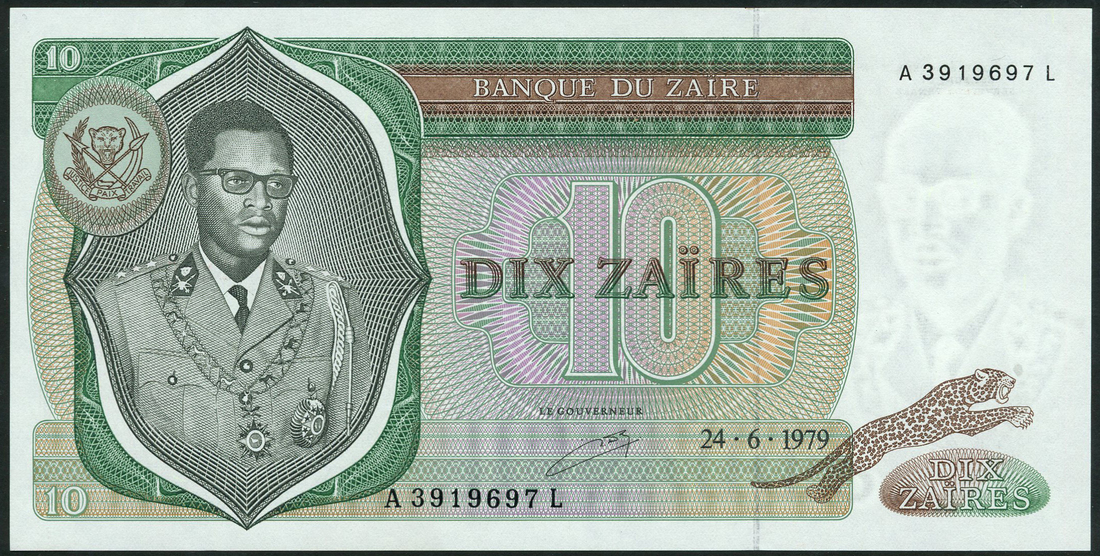 (x) Banque du Zaire, 5 zaires (2), 1979,1980, blue, 10 zaires (2), 1979,1981, green, all Mobutu Seko at left, 50 zaires (3), 1980, red and blue, Mobutu Seko at left, 5 zaires (2), 1982,1985, blue and mauve, 10 zaires (2), 1982,1985, green, 50 zaires (2), 1982,1985, blue and red, 100 zaires (2), 1983,1985, orange and blue, 500 zaires(3), 1984,1985 (2), lilac, 1000 zaires (2), 1985, green, all President Mobutu Seko at right