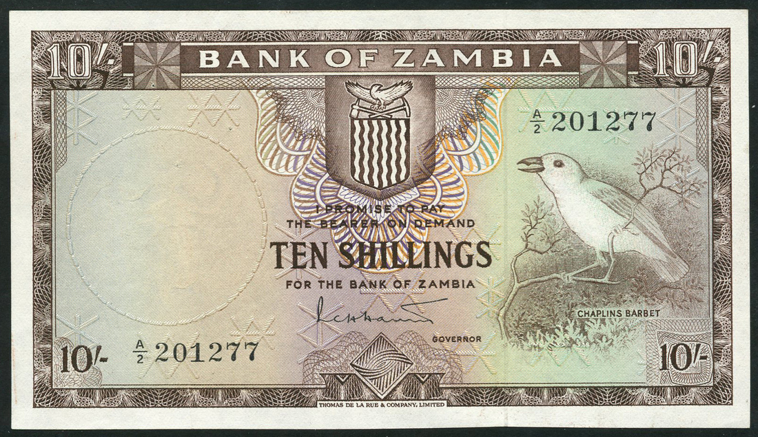 (x) Bank of Zambia, 10 shillings, ND (1964), serial number A/2 201277, brown. pale green and lilac, Chaplins Barbet at right, arms top centre, Richard Hallett signature, reverse brown, tractor and agricultural scene