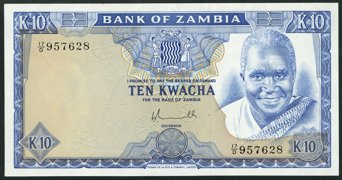 (x) Bank of Zambia, a set of the ND (1974-1976) series comprising 1,2,5 and 10 kwacha, all President Kenneth Kaunda at right, the 2 kwacha Kuwani signature, balance Mwanashiku signature, also a series of the ND (1980-1986) issue comprising 1 kwacha (2), 2 kwacha (3), 5 kwacha (4),10 kwacha (4) and 20 kwacha (5), the 10 kwacha with Kuwani signature (B27b) is a replacement note with serial number 1/Z 626088, also a 50 kwacha, Chivuno signature