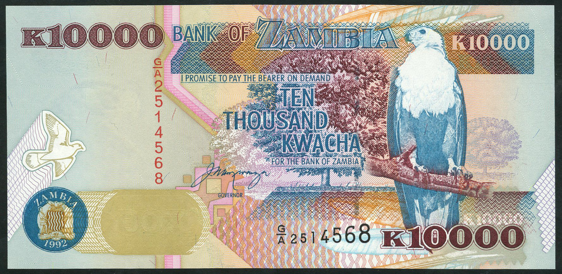 (x) Bank of Zambia, a group of the ND (1989-1991) series comprising 2,5,10 (2),20(2),50 (2),100 and 500 kwacha, all President Kenneth Kaunda at right, Nkhoma or Bussiere signatures, a group of the ND (1992-2011) issues comprising 20 (2), 50 (2), 100 (10), 500 (2), 1000,5000,10000 and a 500 and 1000 kwacha of 2011