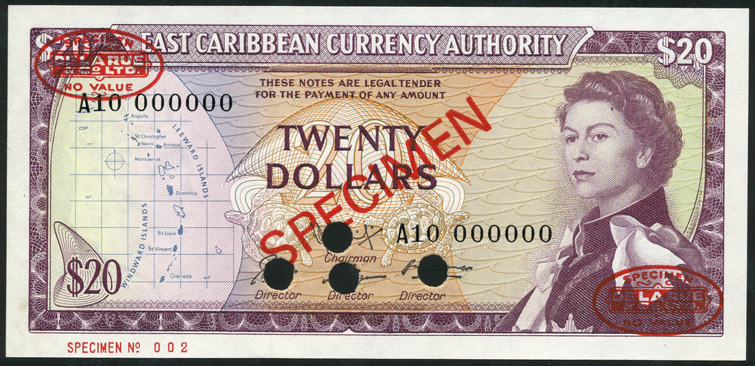 East Caribbean Currency Authority, specimen $20, 1965, serial number A10 000000, purple and multicolour, portrait Queen Elizabeth II at right, map of islands at left, bank title top centre, turtles and value at centre, reverse, palm trees, coastline, ship in distance