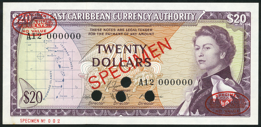 East Caribbean Currency Authority, specimen $20, 1965, serial number A12 000000, purple and multicolour, portrait Queen Elizabeth II at right, map of islands at left, bank title top centre, turtles and value at centre, reverse, palm trees, coastline, ship in distance