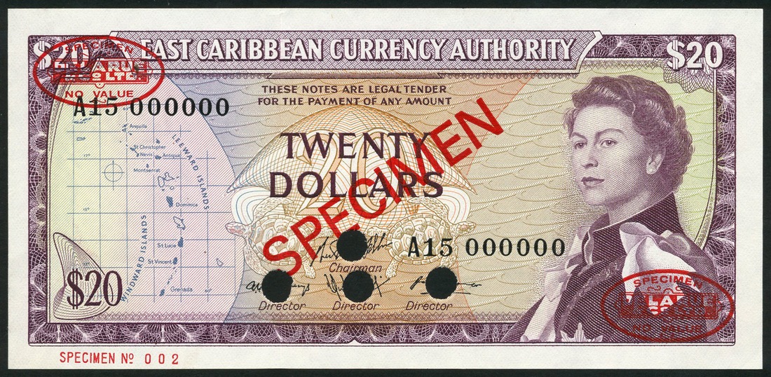 East Caribbean Currency Authority, specimen $20, 1965, serial number A15 000000, purple and multicolour, portrait Queen Elizabeth II at right, map of islands at left, bank title top centre, turtles and value at centre, reverse, palm trees, coastline, ship in distance
