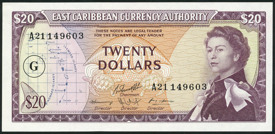 East Caribbean Currency Authority, $20, 1965, serial number A21 149603, purple and multicolour, portrait Queen Elizabeth II at right, map of islands at left, bank title top centre, turtles and value at centre, reverse, palm trees, coastline, ship in distance