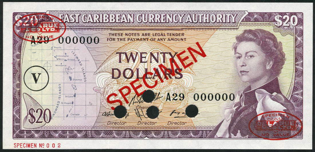 East Caribbean Currency Authority, specimen $20, 1965, serial number A29 000000, purple and multicolour, portrait Queen Elizabeth II at right, map of islands at left, bank title top centre, turtles and value at centre, reverse, palm trees, coastline, ship in distance