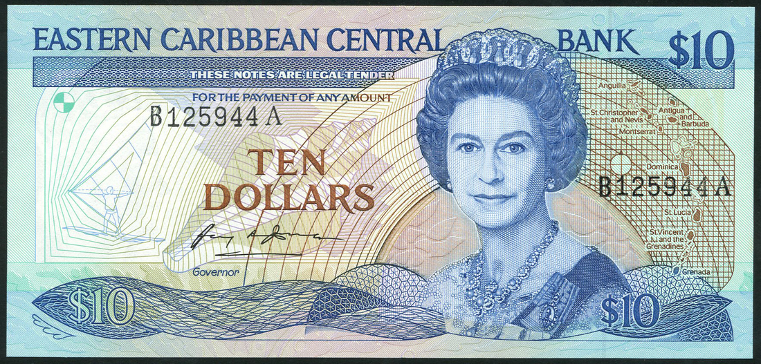 Eastern Caribbean Central Bank, $10 (3), 1985-93, serial numbers B125944A, A 834807 D and B 526508 V, blue on multicolour underprint, portrait Queen Elizabeth II at centre right, bank title top centre, windsurfer at right, map of islands far right, reverse, blue, green and orange, boats in harbour