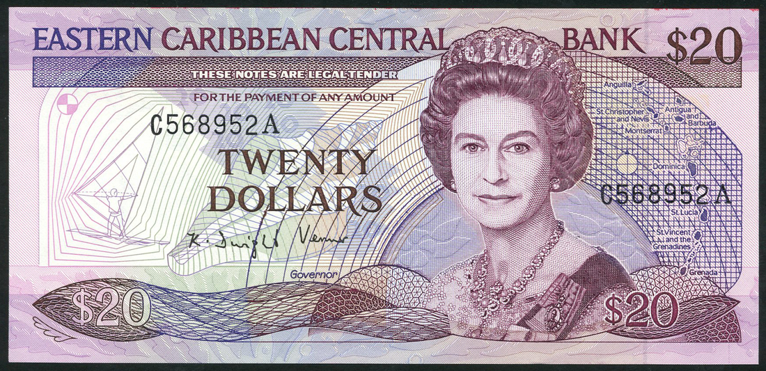 Eastern Caribbean Central Bank, £20, 1988-93, serial number C568952A, purple and multicolour, portrait Queen Elizabeth II at centre right, bank title top centre, windsurfer at right, map of islands at far right, reverse, purple, yellow and green, coastline, palm trees, boat in distance