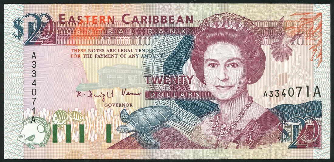 Eastern Caribbean Central Bank, $20, 1993, serial number A334017A, green, purple and multicolour, portrait Queen Elizabeth II at centre right, angel fish low right, turtle low centre, green-throated carib bird top right, reverse, Government House, Montserrat, map of islands at centre, nutmeg plant, angel fish low right