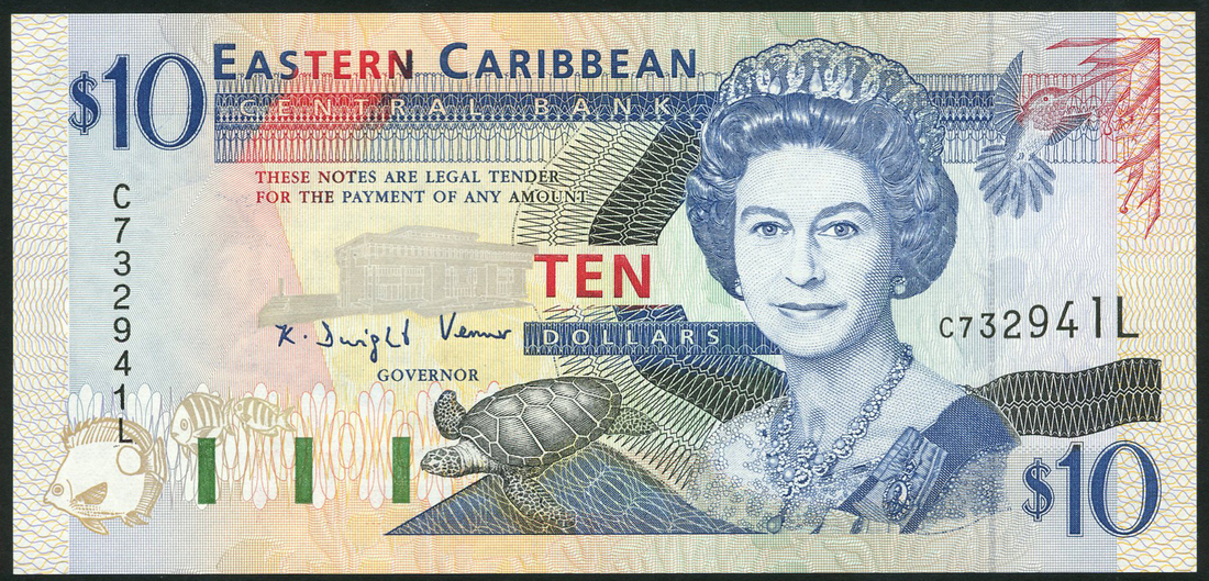 Eastern Caribbean Central Bank, $5 (2), $10 (2), 1994, serial numbers H986038L, A258251M, C732941L and A0844446U, green and blue respectively, portrait Queen Elizabeth II at centre right, angel fish low left, turtle at centre, green-throated carib bird top right