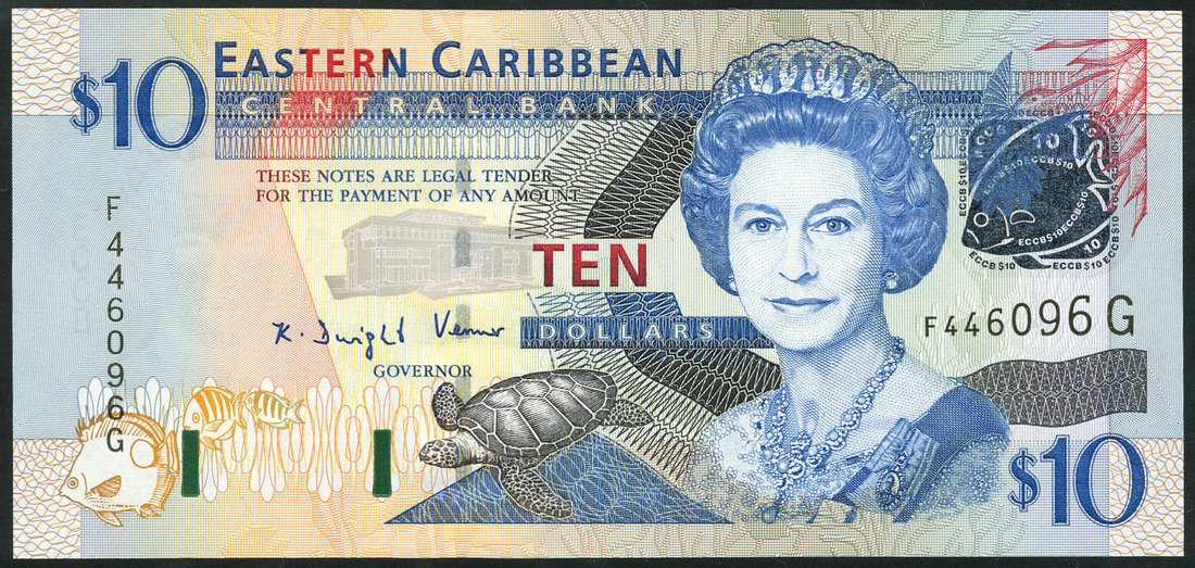 East Caribbean Central Bank, $5 (3), 2003, $10 (4), 2003, serial numbers L 252023 A, G 854418 D, G 497475 K, F 446096 G, E 591002 K, A 753430 M, A 589187 U, green and multicolour and blue and multicolour respectively, portrait Queen Elizabeth II at right, angel fish, turtle and green throated carib bird