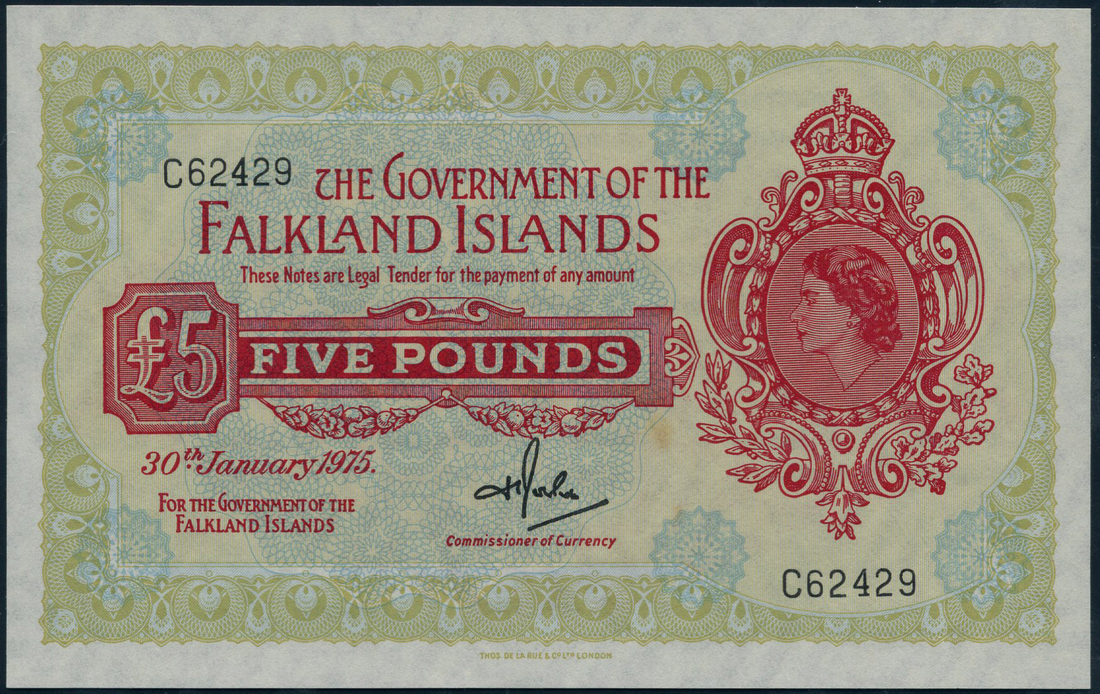 Government of the Falkland Islands, £5, 30 January 1975, serial number C62429, green and red, portrait of Queen Elizabeth II in elaborate frame at right, bank title top centre, value in numerals and text in red tablet at centre, reverse,