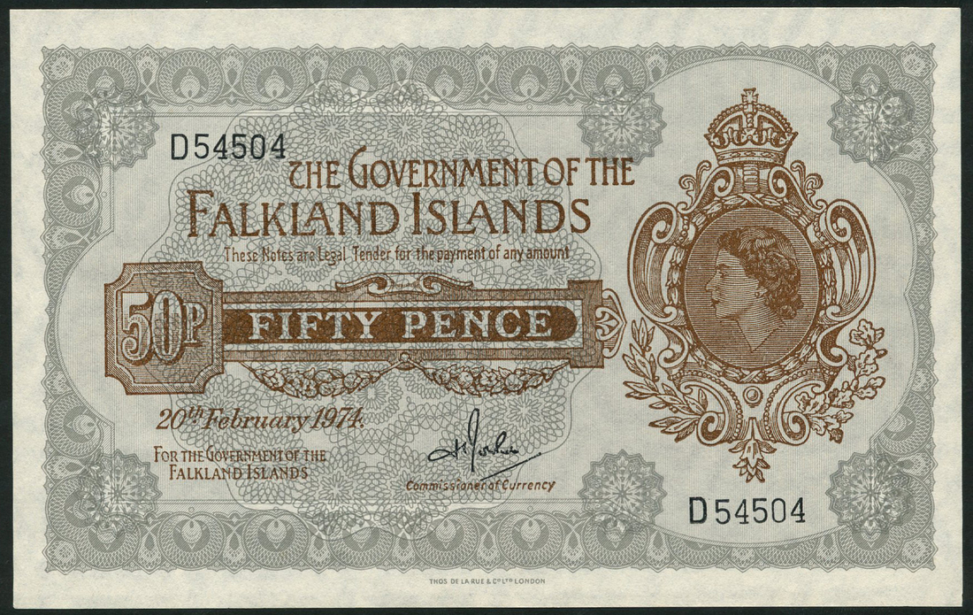 Government of the Falkland Islands, 50 pence, 20 February 1974, serial number D54504, grey and brown, portrait Queen Elizabeth II in ornate frame at right, bank title top centre, value in brown tablet at centre, reverse, light orange guilloche pattern