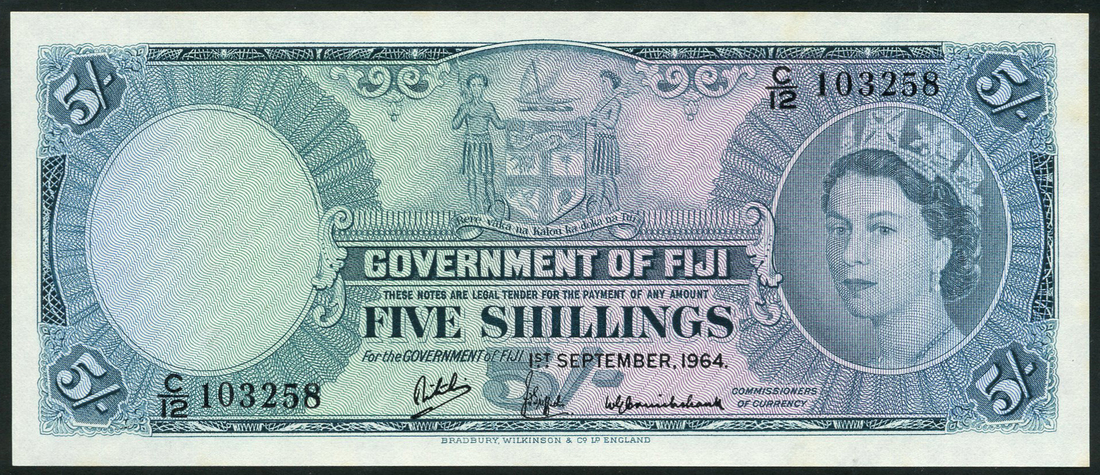 Government of Fiji, 5 shillings, 1 September 1964, serial number C/12 103258, blue, green and violet, portrait Queen Elizabeth II in ornate circular frame at right, coat of arms top centre, reverse, blue-grey guilloche pattern