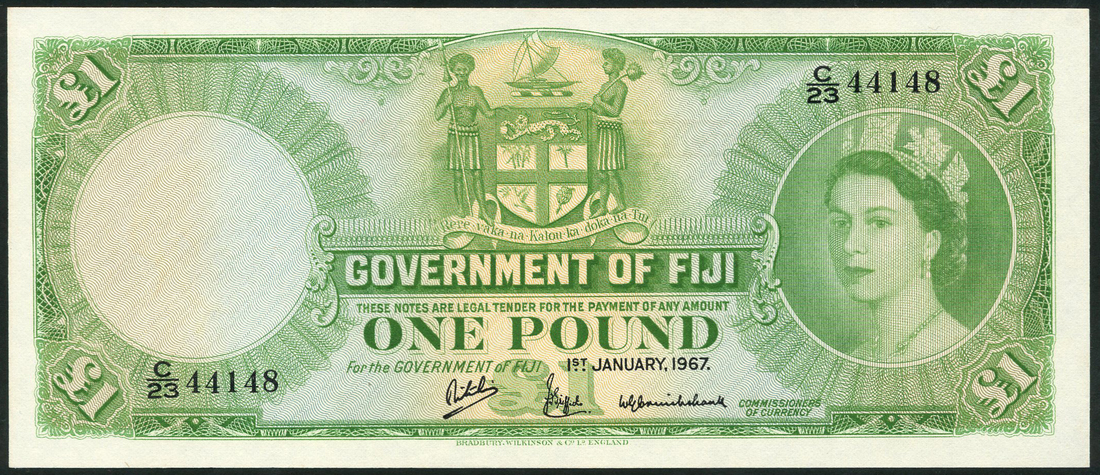 Government of Fiji, £1, 1 January 1967, serial number C/23 44148, green and light tan, portrait Queen Elizabeth II in beautiful circular frame at right, bank title at centre, coat of arms above, value in each corner and at centre, reverse, bank title and value in guilloche pattern