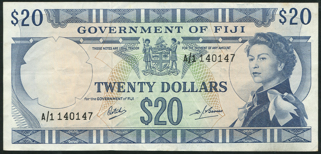 Government of Fiji, $20, 1969, serial number A/1 140147, grey-blue, light green and tan, portrait Queen Elizabeth II at right, coat of arms at centre with bank title above, value top left and right and in text and numerals at centre, reverse, ornate panel