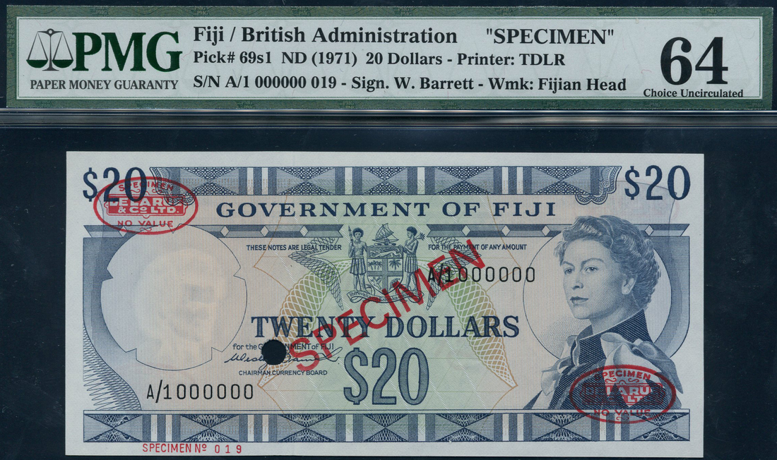 Government of Fiji, specimen $20, 1971 serial number A/1 000000, grey-blue, pale green and orange, portrait Queen Elizabeth II at right, coat of arms top centre, value top left and right and at centre in numerals and text at centre, reverse, ornate panel