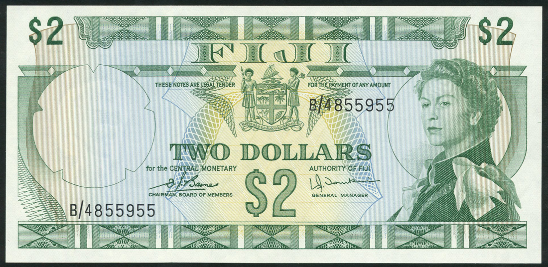 Central Monetary Authority of Fiji, $1 and $2, ND (1974), serial numbers B/4 480915 and B/4 855955, brown, light green and pink and green, light blue and yellow respectively, portrait Queen Elizabeth II at right, value top left and right and in text and numerals at centre, coat of arms, reverse, panel with value in each corner and at centre