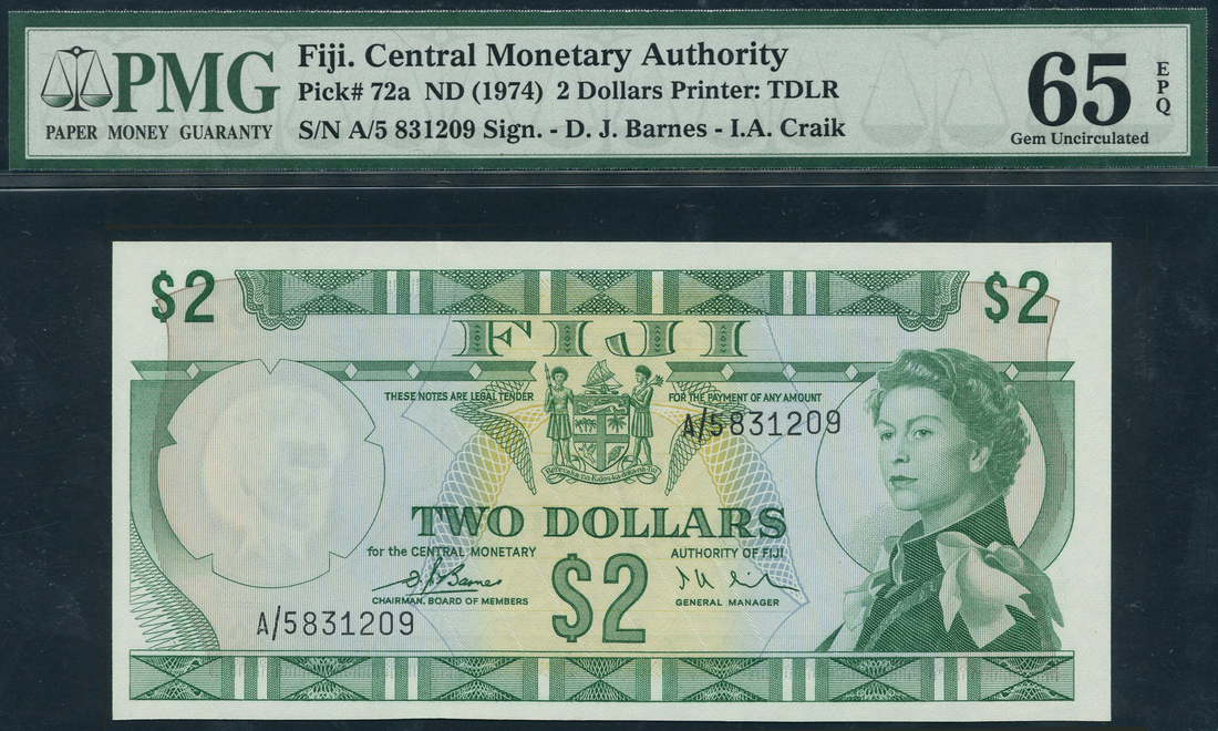 Central Monetary Authority of Fiji, $2, ND (1974), serial number A/5831209, green and light yellow, portrait Queen Elizabeth II at right, coat of arms top centre, value top left and right and at centre in figures and text, reverse, ornate panel