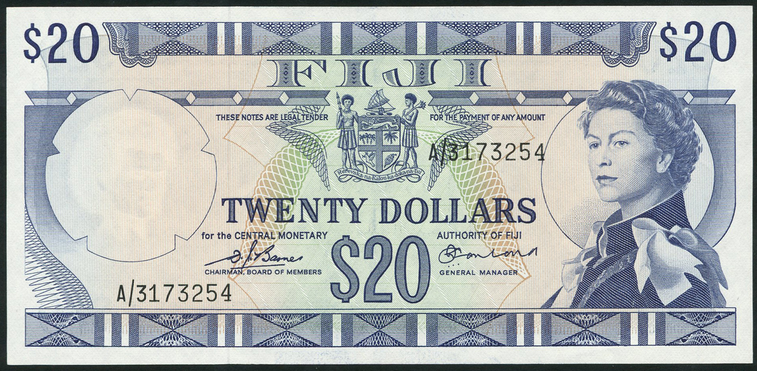 Central Monetary Authority of Fiji, $5, $20, ND (1974), serial numbers A/2 438557 and A/3 173254, orange and violet and dark blue, light green and tan respectively, portrait Queen Elizabeth II at right, coat of arms at centre, reverse, ornate panel
