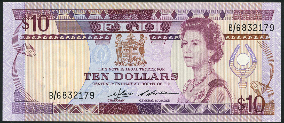 Central Monetary Authority of Fiji, $2, $5 and $10, ND (1983, 1986 (2)), serial numbers C/9 157702, B/5 118460 and B/6 832179, green, orange and purple respectively, portrait Queen Elizabeth II at right, coat of arms at centre, reverse, harvesting sugarcane, group of men fishing with circular net, ceremonial dance