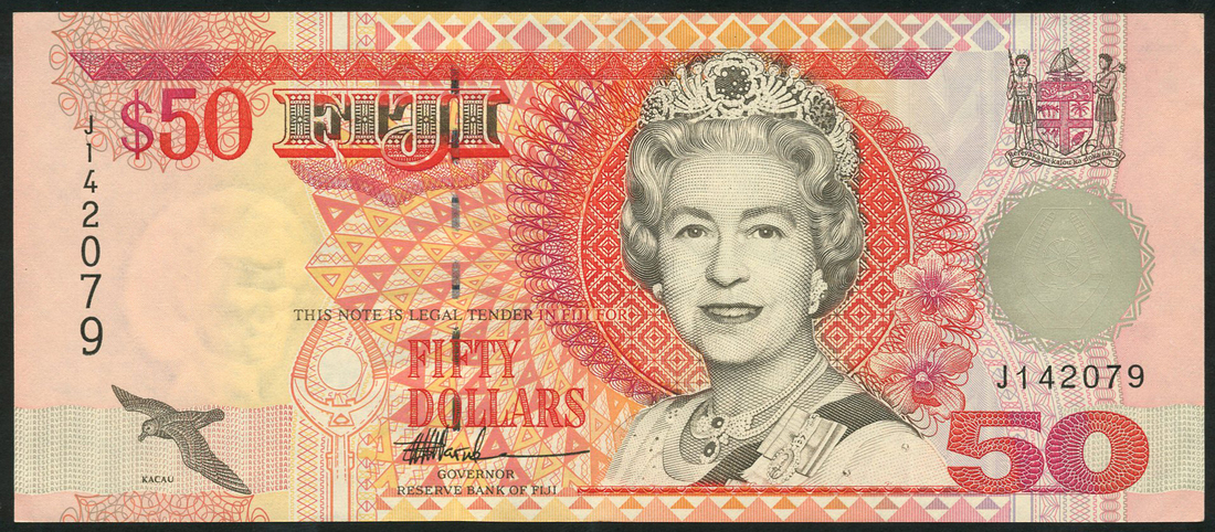 Reserve Bank of Fiji, $50, ND (1996), serial number J142079, red, orange and multicolour, portrait Queen Elizabeth II at centre right, kacau bird low left and coat of arms top right, reverse, depiction of the signing of the deed of cession, cession stone and flag raising ceremony, flowers low right